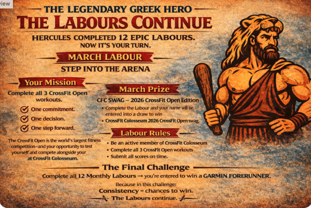 Complete the Labour and your name will be entered into a draw to win CrossFit Colosseum 2026 CrossFit Open swag.